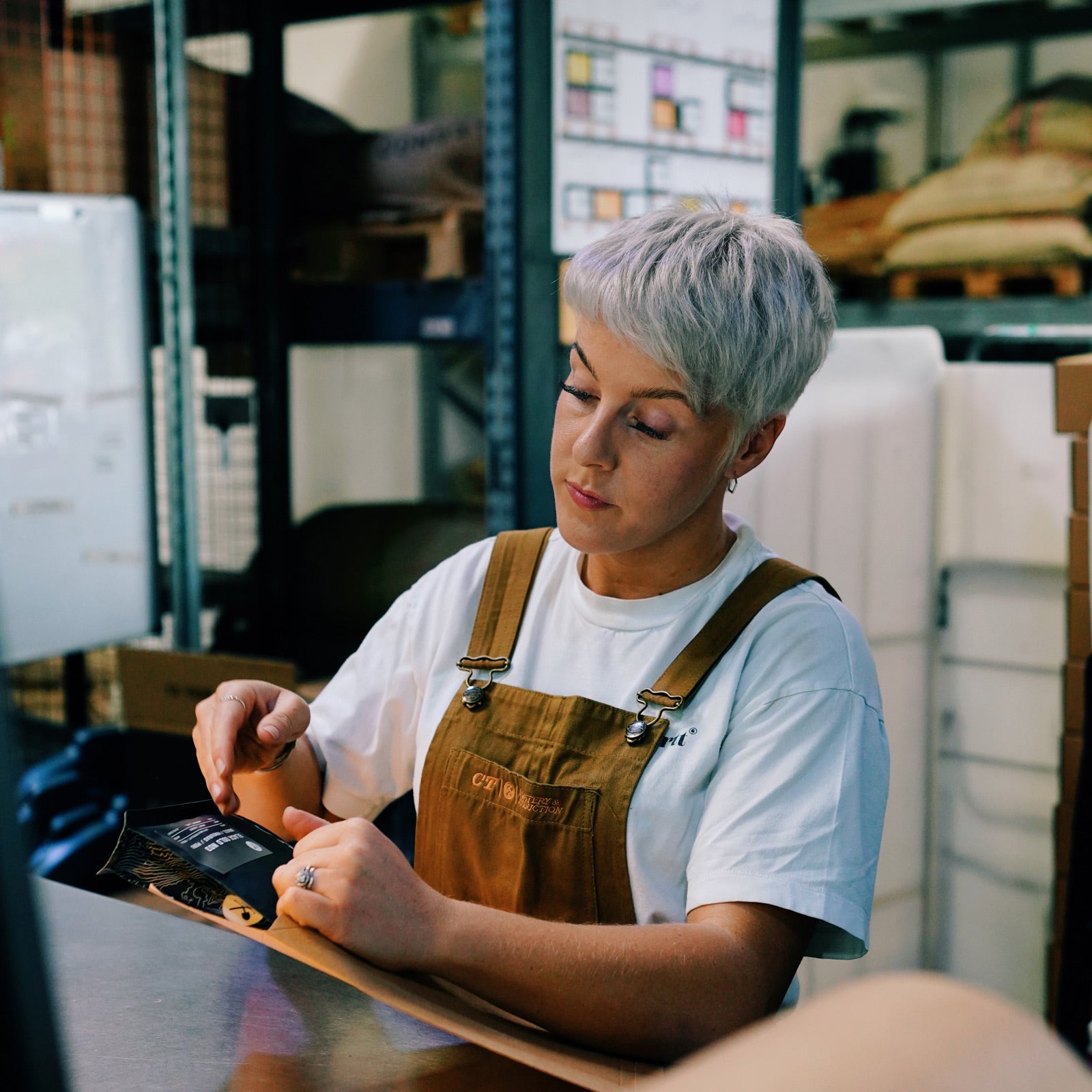 We prioritise sustainability across our operations. Our cups are fully compostable, sourced from a B Corp partner, Decent Packaging and our coffee bags are fully recyclable. We donate waste coffee chaff and grounds to local gardening groups for composting and educate our wholesale clients on eco-friendly practices. Our roastery runs on zero carbon electricity and our uniforms are made from 100% organic cotton with vegan, phthalate-free inks.