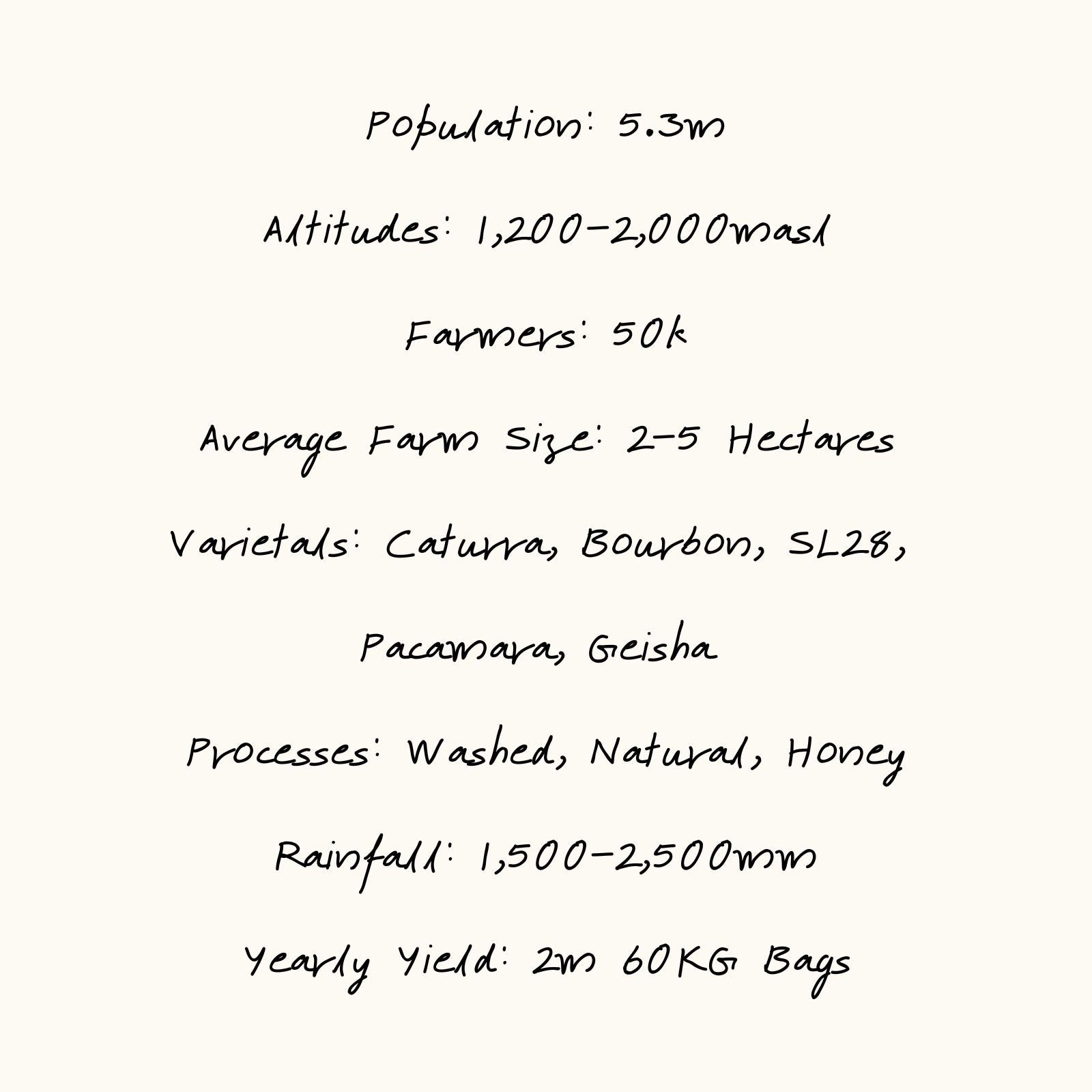 The country's perfect growing conditions are complemented by a harvest season from October to March, with most coffee being hand-picked due to the steep terrain. Costa Rica even pioneered the "honey" processing method, where part of the coffee cherry’s mucilage is left on the bean for a sweeter, more complex flavour. Costa Rica is divided into eight coffee-growing regions, each producing unique flavours. The Tarrazu region, in particular, is famous for its premium coffee, often with notes of dark chocolate and grapefruit. Despite its small size, Costa Rica produces over 1.5 million bags of coffee each year, with about 90% of it exported globally.