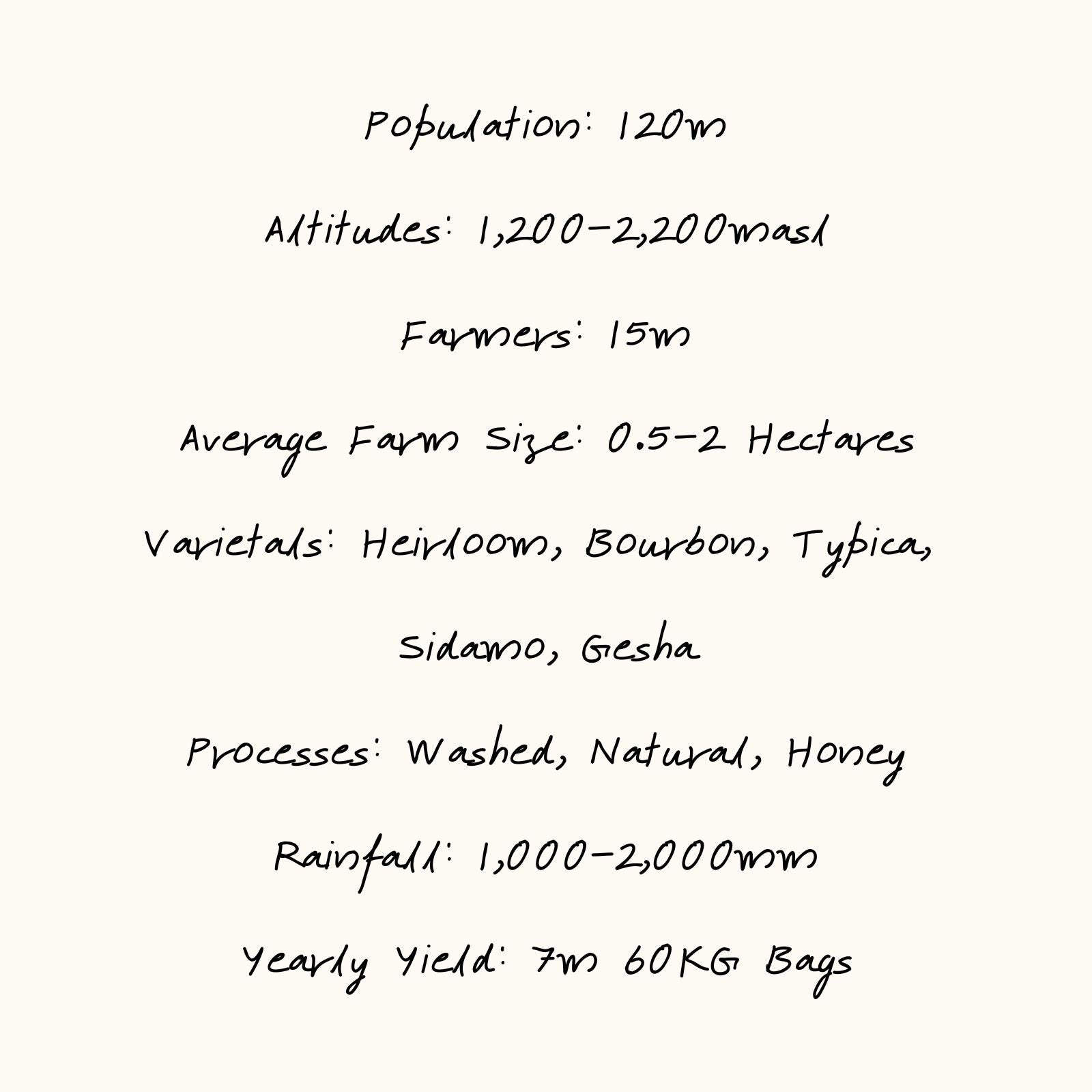 Most of Ethiopas coffee is high-quality Arabica, grown by millions of smallholder farmers across the country. Ethiopia’s diverse climate, ranging from tropical cloud forests to cool zones, results in distinct coffee profiles from regions like Harar, Sidamo, Yirgacheffe and Limu.