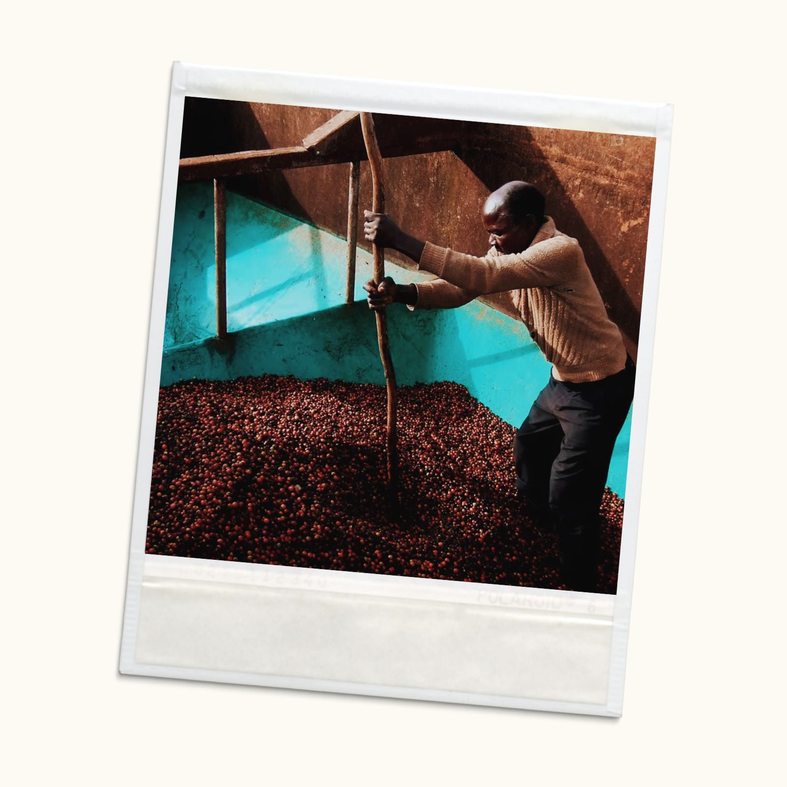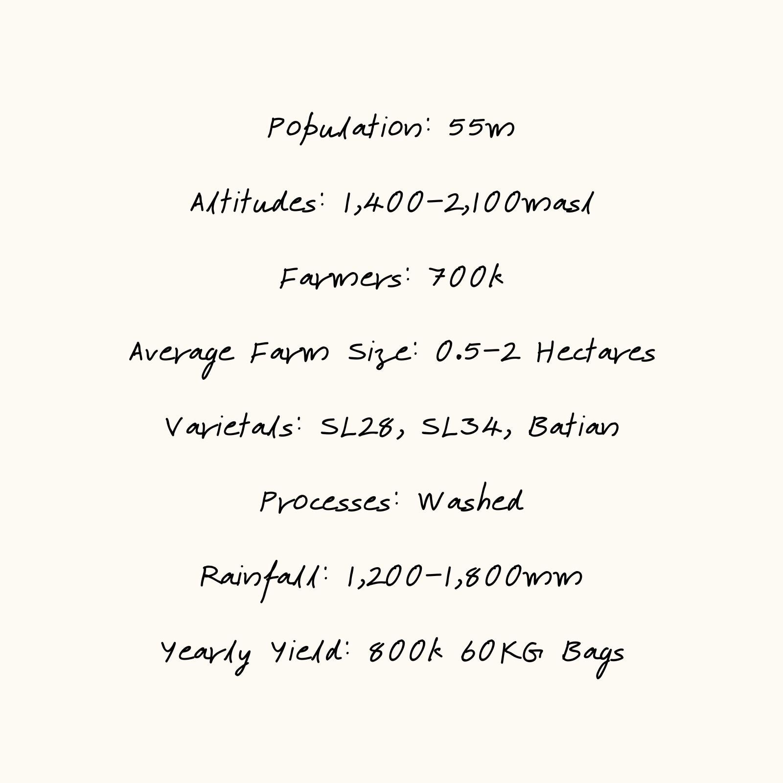 Most Kenyan coffee comes from small farms, or ‘shambas’, where farmers grow coffee in the shade, along with vegetables, fruits and even livestock. The iconic SL28 and SL34 coffee varieties, developed in the 1930s, are known worldwide for their complex flavours and bright, lemony acidity. These varieties thrive in the Central Highlands, particularly on the southern slopes of Mt. Kenya and in the foothills of the Aberdare Mountains (Nyandarua Mountains), where the high altitudes and fertile volcanic soils create the perfect conditions for exceptional coffee.